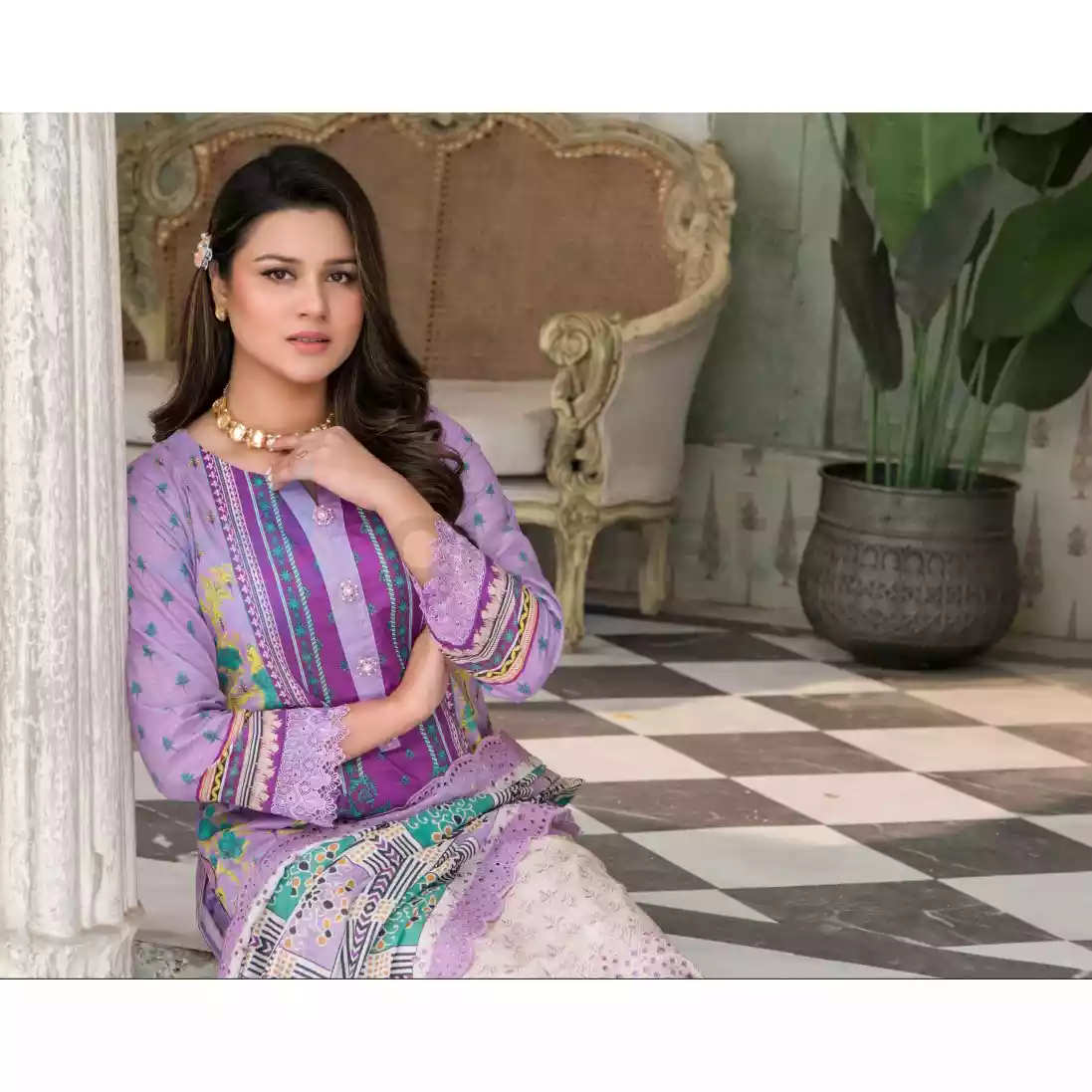 • Front Part: Luxury Digital Printed Embroidered Stripe Lawn with Cut-Work