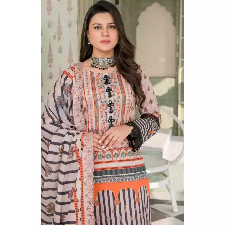 Pakistani Luxury Printed Embroidered Stripe Lawn with Jacquard Voil Dupatta-1029
