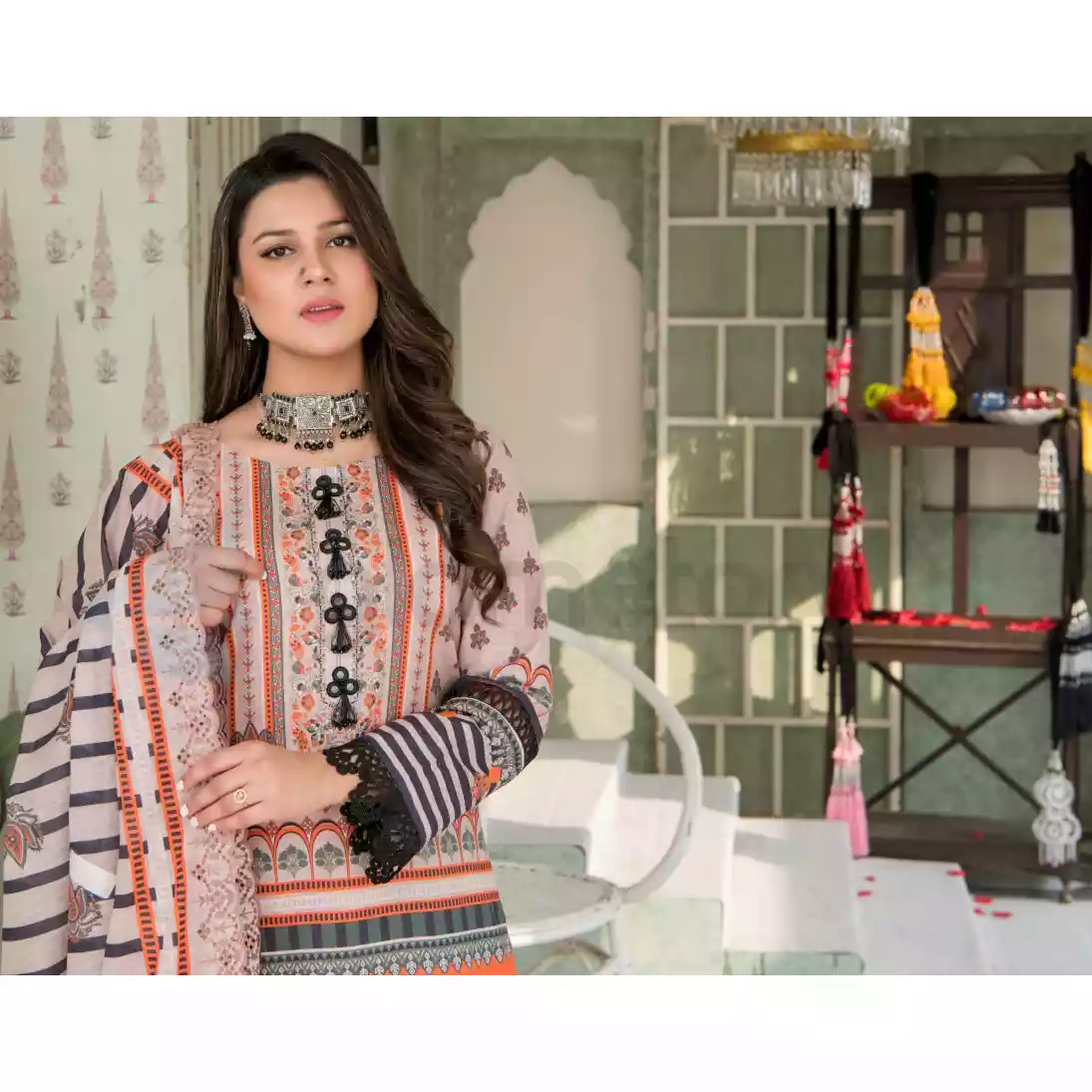 • Front Part: Luxury Digital Printed Embroidered Stripe Lawn with Cut-Work